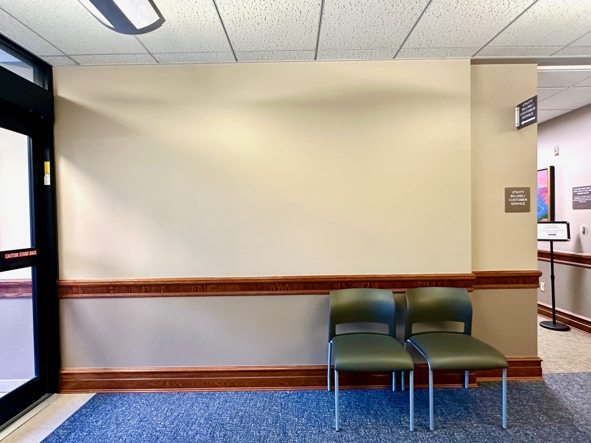 - Interior location: Lower level to City Hall entry, near Utility Billing.